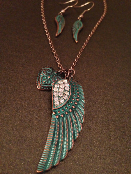 Crystal Feather Pendant Necklace Set (Patina Turquoise)