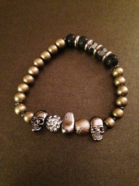 Metal Stone and Crystal Beads with Metal Skull Bracelet